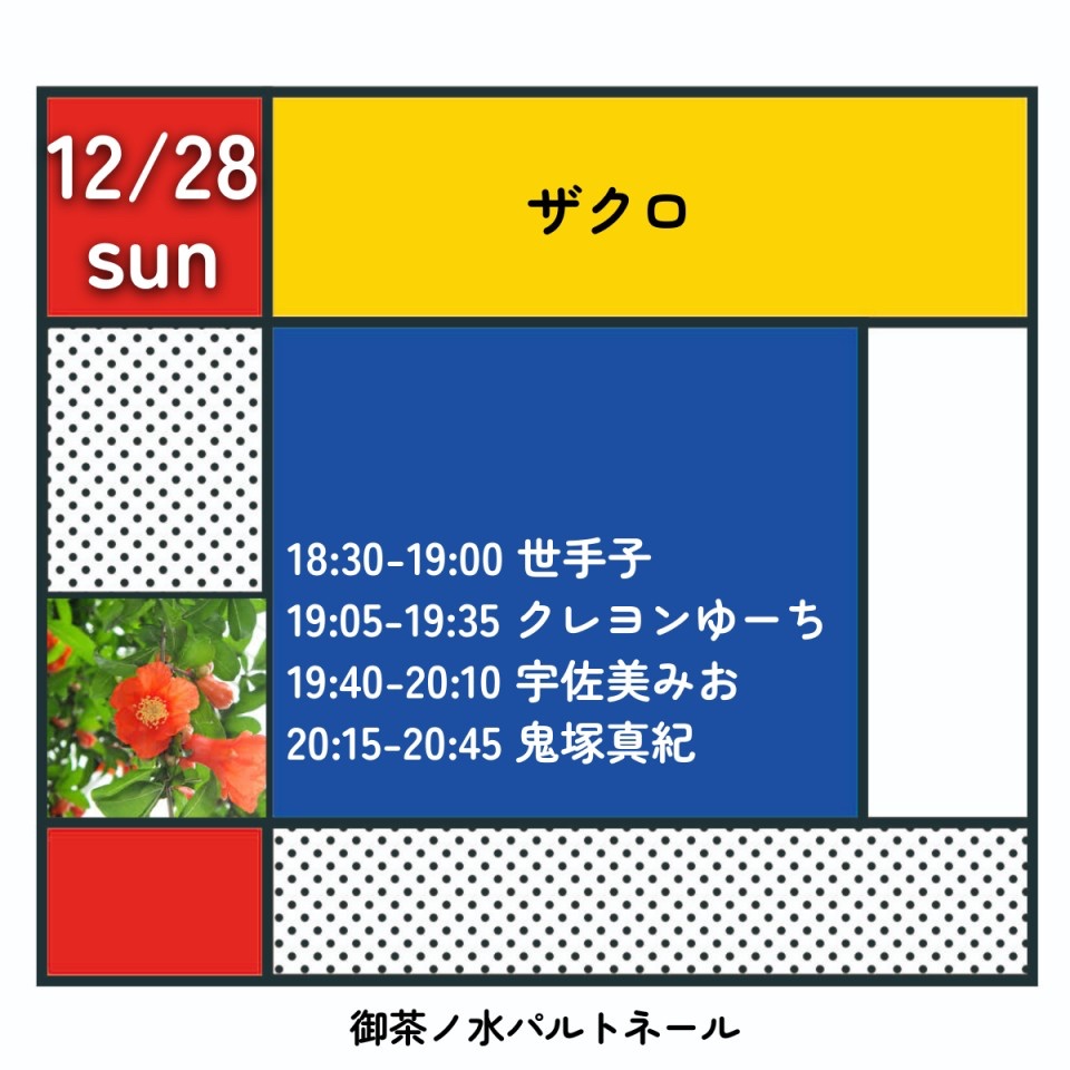 2025/12/28(日)@御茶ノ水パルトネール世手子/クレヨンゆーち/宇佐美みお/鬼塚真紀OPEN18:00 START18:30 ADV¥3000 (1drink別)配信チケット2000円https://twitcasting.tv/china2i/shopcart/401212